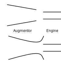 The addition of an augmentor won't affect the amount of fuel consumed so it also increases the effective fuel-efficiency at the same time. In their simplest form, a thrust augmentor is just a divergent (ie: bigger at the back than the front) cone into which the exhaust gases are fired. However, more efficient units use two cones or have an airfoil shaped contour. A thrust augmentor does for the pulsejet what an afterburner does for a turbojet.