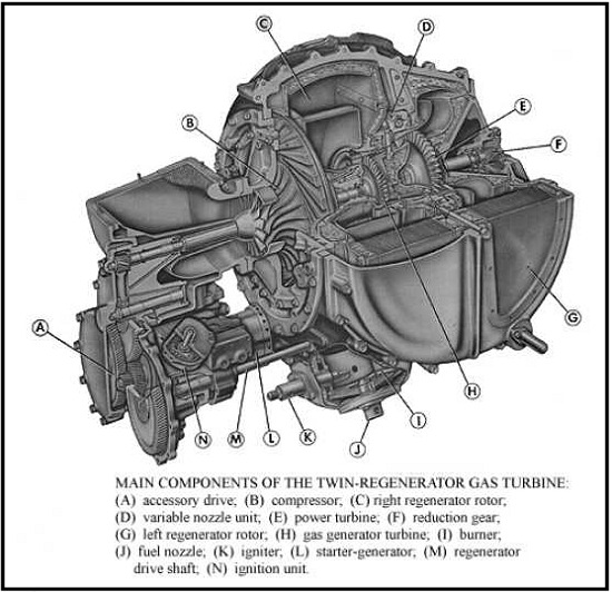 The large round section on most engines is the rotating regenerator, a device that transfers heat from the exhaust gases to the air about to enter the combustion chambers. This is done to improve the engine's fuel-efficiency and to reduce the noise and heat levels released at the car's tailpipe.