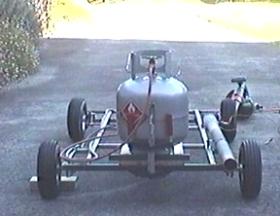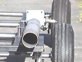 Just working from a "seat of the pants" feeling, I'd say that the kart is probably capable of well over 50-60 mph -- the limiting factor probably being the driver's ability to keep it going in a straight line and the lack of aerodynamics. Yes -- I discovered that the steering on my kart is "very direct" which makes keeping it going in a straight line at 30 mph on a loose surface quite a challenge -- especially considering that I don't have a foot-operated throttle but rely on turning a knob on my gas-line. It takes three full turns go from idle to full power -- and that only leaves one hand free for steering so I expect you can imagine just how exciting the first test-drive really was. Unfortunately there was nobody here to videotape the first run with the big pulsejet engine but I'll try to convince someone to stand around with a camera while it's running next time. Another problem I encountered was that the aluminum strap I used to secure the tailpipe of the engine to the kart frame just melted away. I'll have to make a new one from steel. Fuel economy? What's that? The kart consumed 4Kgs (about 10 lbs) of LPG during the 3-4 minutes I spent on the first run. That's about $2-$3 a minute in fuel costs! Now I'm going to get on with the turboshaft engine and fit that -- it should provide better fuel economy and stronger "off the line" acceleration.
