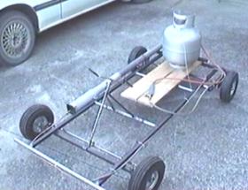 Now I have an uncompleted, but pulse jet powered, kart! However, after going to all this trouble I discovered that my propane tank is so close to empty that I can't get enough pressure to run the engine up to full power. So here it is -- the "I cant wait, pre-turbine" version with comfortable wooden plank seating and near-empty fuel-tank.