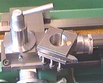 The toolholders slip over this post and are made from a block of aluminum or steel (I used plain 1080 low-carbon steel for mine). Note that the holder is just a 50mm x 50mm x 25mm block which has a slot milled in one side to take the toolbit and a 28mm hole bored through the center. Holes for the three 6mm toolbit retaining bolts were drilled and tapped so that the toolbit can be clamped firmly in the holder and another 6mm bolt is used as a height-adjuster. The side opposite the toolbit is slit right through and a 6mm pinch-bolt is used to pull the two sides together so that the holder can be clamped against the toolpost.